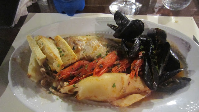 After an apertivo on Via Garibaldi we returned to Tavernetta Ai Lumi for dinner. We always eat there when we are in Trapani. Linden had smoked swordfish stuffed with goats cheese and aubergine, followed by tuna steak. Matthew had crumbed squid followed by a "fish soup" which was really a whole lot of fantastic seafood sitting on a little bisque.